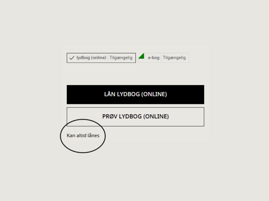 Du kan også finde inspiration til Bøger, du altid kan låne, ved at klikke ind på siden herunder. Vær dog opmærksom på, at det ikke altid er både e-bogen og lydbogen, der kan lånes uden for din normale kvote, selvom bøgerne på denne side præsenteres som værker frem for enkeltmaterialer.