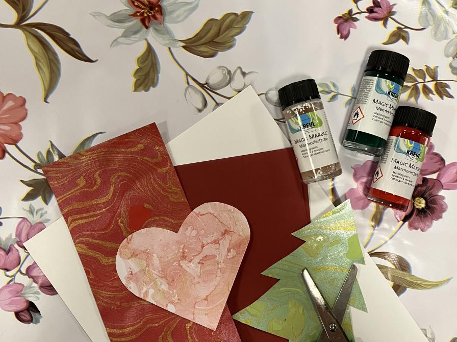 Stik hovedet ind forbi vores pop-op workshop på biblioteket til Rødovres julemarked, når vi skal lave flotte, håndfarvede papirer med marmoreringseffekt, som du kan lave julekort eller -pynt af